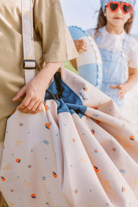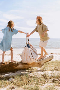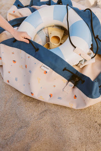 A zsákhoz praktikus heveder tartozik, amelynek köszönhetően könnyedén vállra dobható, mint egy táska. A zsák közepén van egy kis lyuk, ahol a tengerparton töltött nap után az összes felesleges homokot ki lehet önteni, hogy feleslegesen ne cipeljük magunkkal haza :-).