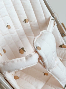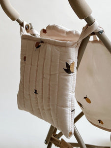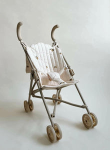Konges Slojd játék babakocsi. Stabil, dupla kerekekkel. Övvel, hogy a baba ne essen ki és egy táskával minden szükséges dologhoz. A 100% organikus pamutból készült anyag levehető. A babakocsit összeszerelve, összecsukva szállítjuk. Könnyen kezelhető.