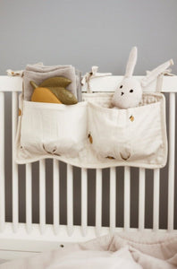 Praktikus zsebek babaágyhoz, amelyben a baba nyugodt pihenéséhez szükséges dolgokat, pelenkákat vagy kis játékokat tárolhat, egyszóval mindent, aminek kéznél kell lennie. Két zsebes, zsinórral köthető a kiságyhoz.