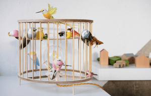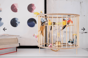 Egy asztali lámpa, ami a gyerekszobába a természet egy darabját hozza el. Nyírfából készült és kalitkának van kialakítva, amelyen puha polisztirolból készült madarak ülnek, kézzel festett tollazattal.