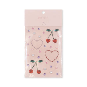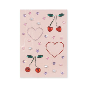 • Csillogó díszkövekkel díszített lap – 2x nagy cseresznye, 2x nagy szív, kis kövek szívek és csillagok formájában, kis gyöngyök