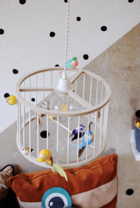 Gyerek függőlámpa, amely a gyerekszobába a természet egy darabját hozza el. Nyírfából készült és kalitkának van kialakítva, amelyen puha polisztirolból készült madarak ülnek, kézzel festett tollazattal.