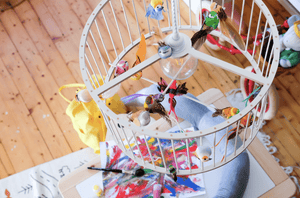 Gyerek függőlámpa, amely a gyerekszobába a természet egy darabját hozza el. Nyírfából készült és kalitkának van kialakítva, amelyen puha polisztirolból készült madarak ülnek, kézzel festett tollazattal.