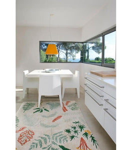 Ez a mosógéppel kimosható, spanyol Lorena Canals márkájú szőnyeg trendi természetes dizájnnal rendelkezik.  Ennek köszönhetően lányos és fiús szobába is beleillik (de ugyanúgy nappaliba és hálószóbába is leteríthető).  A trópusi növények levél mintája ízléses kiegészítő és felfrissíti a lakást.