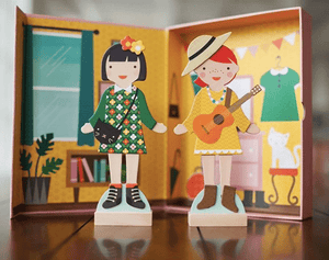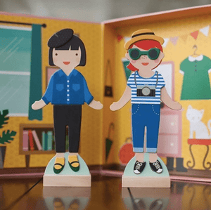 A kreatív készlet tartalmaz két fa babát és 49 darab mágnest - ruházatot és kiegészítőket, amelyek kölcsönösen kombinálhatóak, s így 200 különböző outfitet hozhatnak létre. A készlet utazásra is alkalmas, dobozba van csomagolva, amit mágnessel lehet lezárni. Ez a doboz háttérként is szolgál a mágneses babák elhelyezésére.