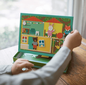 A kreatív készlet része a mágneses tábla, két háttér, és több mint 70 darab mágneses kép. Alkalmas utazásra, praktikusan van csomagolva, kemény karton dobozban elasztikus szalaggal.