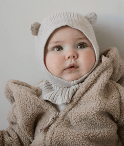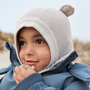 A kötött balaklavának köszönhetően a gyermekek feje és nyaka melegen marad. Puha és kényelmes, 100% organikus pamutból készült. Az arc és a nyak körüli bordázott anyag, a legkényelmesebb viseletért. Aranyos medvefülekkel.