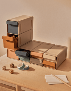 A tároló két fiókos dobozokhoz való keretet, három nagyobb és hat kisebb fiókot, valamint négy szilikon csúszásgátló lábat tartalmaz.