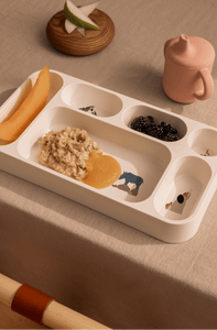 Tányér - hat különálló rekesszel ellátott tálca, így az egyes ételeket külön-külön tálalhatja a gyerekeknek, és megismerkedhetnek a megjelenésükkel és az ízeikkel. A hosszúkás formának köszönhetően a gyerekeknek minden közül választhatnak, és a tányér stabilan áll az asztalon. 6 hónapos kortól, vagy amikor már önállóan étkeznek. Mosogatógépben mosható.