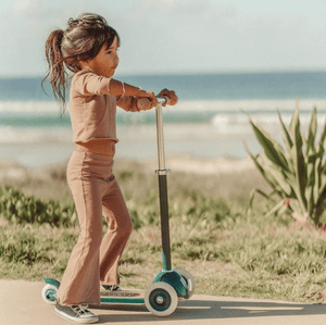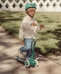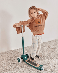 Három kerékkel ellátott roller hároméves gyermekek számára, 50 kg teherbírással. Stílusos fonott kosárral (amely azonban könnyen eltávolítható, ha anélkül jobban tetszik). A roller állítható magasságú kormánnyal rendelkezik, T betű alakjában. A kormány oldalra döntésével irányítható - a gyermekek nagyon könnyen megértik az irányítás módját, és maximálisan élvezik a roller vezetését. A három keréknek köszönhetően a roller egyedül is megáll, így nem dől el, amikor a gyermek leszáll róla.