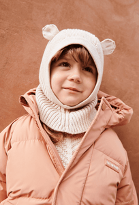 A kötött balaklavának köszönhetően a gyermekek feje és nyaka melegen marad. Puha és kényelmes, 100% organikus pamutból készült. Az arc és a nyak körüli bordázott anyag, a legkényelmesebb viseletért. Aranyos medvefülekkel.