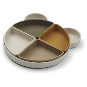 Szilikon tányér és négy belehelyezhető tálka. A tányér a tálak eltávolítása után is teljesen működőképes. A Liewood Arne tálnak köszönhetően az étkezés szórakoztatóbb lesz. Mosogatógépben mosható.