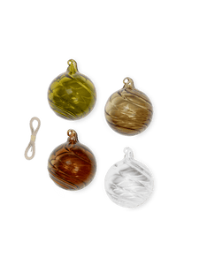 Teremtsen ünnepi hangulatot a kézzel fújt ferm LIVING Twirl díszekkel. Az üveggolyók szépen visszaverik a fényt, diszkrétek és elegánsak egyben. A négy különböző színű díszkészletet selyemszalag egészíti ki, így a díszeket a kívánt magasságba akaszthatja fel.