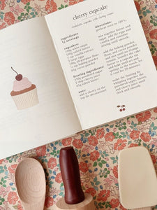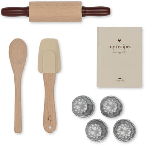 A készlet tartalmaz egy sodrófát, egy spatulát, egy fakanalat, négy formát és egy papírkönyvet receptekkel (például citromos süteményhez vagy cseresznyés süteményhez), valamint üres oldalakkal, ahova saját receptek jegyezhetőek fel. Minden kofferbe csomagolva. Élelmiszerrel érintkezve biztonságos.