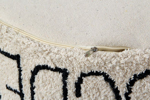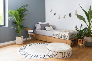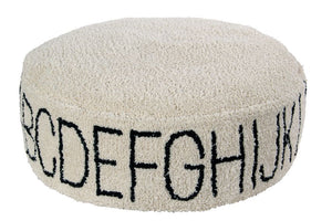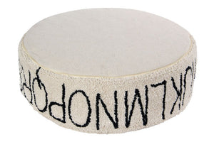 Természetes színű ülőpuff, népszerű ábécével. Praktikus, ötletes és könnyen kombinálható kiegészítő a gyerekszobába. Cipzáros huzattal, a huzat otthon mosógépben mosható.